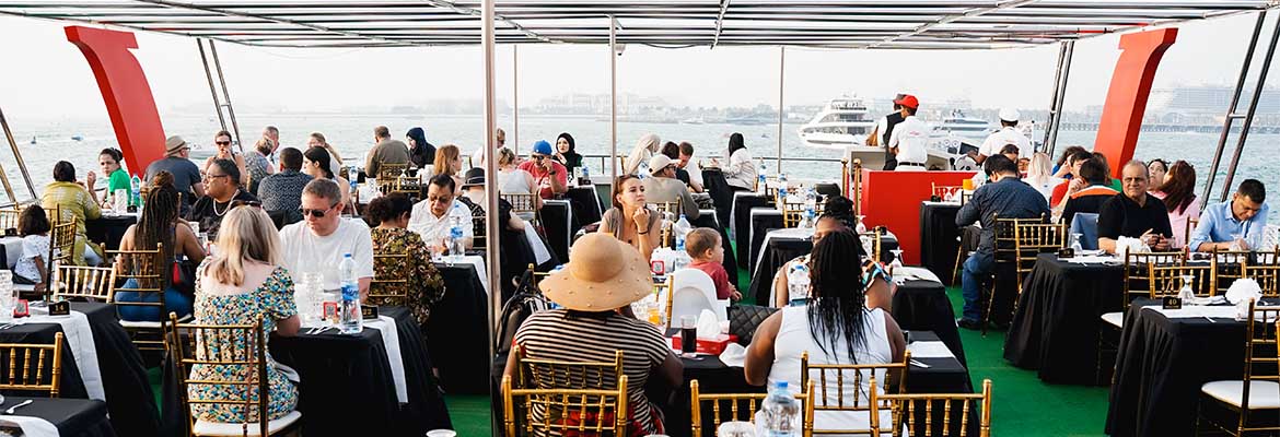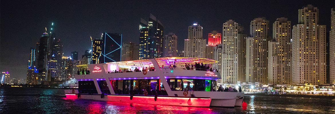 Step aboard a luxurious glass-enclosed boat for a 90-minute dinner cruise along Dubai Marina. Enjoy stunning nighttime views of the skyline, live music, and a delicious international buffet. Relax on the fully air-conditioned lower deck or take in the fresh air on the open-air upper deck while sipping unlimited soft drinks, tea, coffee, and water. This cruise offers an elegant, intimate way to experience Dubai Marina by night